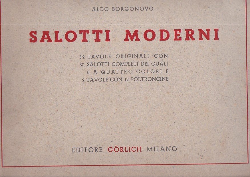 In-4° oblungo, brossura editoriale. 32 tavole originali con 30 salotti completi, dei quali 8 a quattro colori e 2 tavole con 12 poltroncine. Ottimo stato.