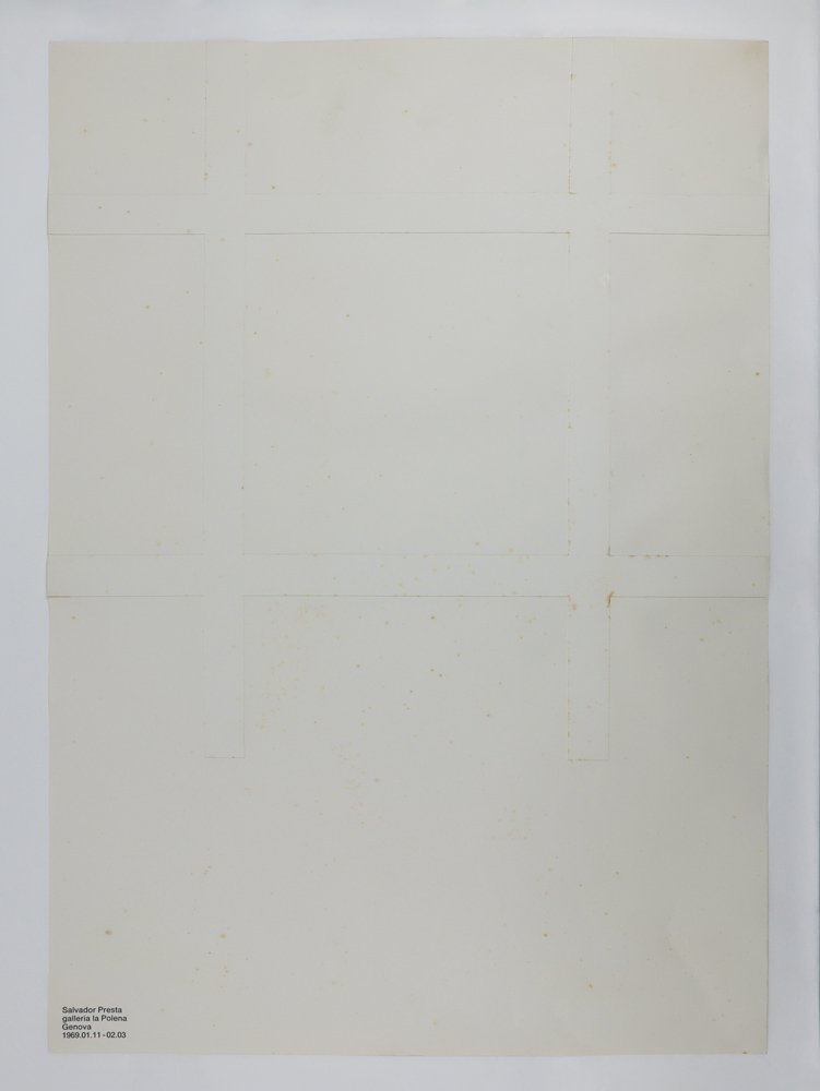 MANIFESTOPoster originale della mostra.Leggera puntinatura di foxing e minima gualcitura agli angoli di sinistra dell’applique; per il resto in ottime condizioni.Grafico prima che designer e architetto, Angiolo Giuseppe Fronzoni — noto come AG Fronzoni — ha associato la sua ricerca e la sua attività creativa a un’immagine di geometrica sobrietà, come rivelano immediatamente la celebre gamma di mobili «Serie 64», la lampada «Quadra» del 1962 o le essenziali valigie «Forma zero» realizzate per Valextra nel 1963. Minimalista nemico di ogni inutile ornamento, Fronzoni ha fatto della rigorosa pulizia delle forme un segno distintivo, alla perenne ricerca dell’essenza di un progetto e dell’equilibrio nell’asimmetria — poiché «la simmetria appartiene al passato, mentre l'asimmetria è moderna […] è dinamica, ed è un punto fermo per il progettare contemporaneo» (cit. in Ester Manitto, A lezione con AG Fronzoni, 2017). -- Uno degli incontri più importanti della sua vita fu proprio quello con il mercante d’arte Edoardo Manzoni, che con Rosa Leonardi aveva appena aperto a Genova la Galleria La Polena e «gli chiese di occuparsi dell'allestimento, assieme alla ristrutturazione di casa sua. I primi arredi nacquero così, per quei due spazi», ricorda la figlia in un’intervista al «Corriere» (16 ottobre 2014): furono i prototipi della celebre «Serie 64». Per la linea grafico-editoriale della galleria Fronzoni progettò una tipologia di layout mai più abbandonata: formato quadrato, carta bianca, semplice tipografia nera in rigoroso minuscolo sans serif impaginata agli angoli o sui bordi del foglio, secondo «un’altra delle caratteristiche compositive del linguaggio grafico di Fronzoni[, che] consiste nel suo prediligere i margini del foglio rispetto alla sua area centrale. E allora, come se le lettere e le forme fossero sottoposte a un magnetismo periferico, accade che esse si vengono a condensare nei bordi, raggruppate secondo andamenti lineari, a volte diagonali, oppure cubiformi o addirittura sinuosi» (Maria Luisa Ghianda su «Doppiozero», online). -- La vera sfida divennero allora i poster — dal celebre Lucio Fontana dell’ottobre 1966 a questo Salvador Presta del gennaio 1969, entrambi conservati nella collezione permanente del MoMa di New York — dove il centro del foglio bianco lasciava spazio alla creatività del designer nell’interpretare l’opera dell’artista. -- Nel poster per l’esposizione di Presta alla Polena l’idea di Fronzoni fu un’applique di strisce perpendicolari bianche a creare un millimetrico spessore sul fondo bianco, proprio come nelle «trame» dell’artista italo-argentino, le cui opere degli anni sessanta avevano, peraltro, una straordinaria affinità con l’estetica di AG Fronzoni: «Cinetismo, percettivismo, effetti spaziali, sono altrettanti fenomeni riscontrabili nell’opera di Presta […]. Oltre che con la luce, questi quadri agiscono in relazione con lo spazio e con lo scorrere del tempo. Su fondi bianchi presta applica “trame” bianche, creando una sottile intercapedine di luci ed ombre atta a fornire una continua interazione con l’ambiente» (Tommaso Trini su «Domus» del maggio 1967).