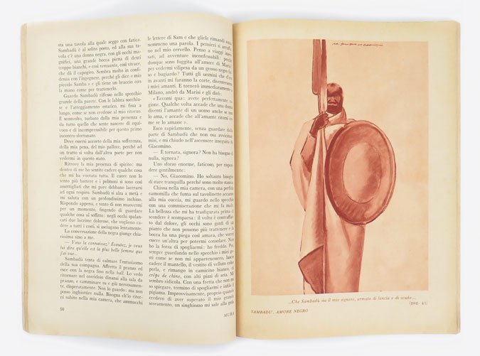 LIBROPrima edizione.Esemplare in ottimo stato (localizzati restauri professionali al perimetro della copertina, che tuttavia è completa e complessivamente bene tenuta; veniale piccola mancanza al bordo della carta 37/8, senza alcuna perdita di testo): rarissima condizione per questo tipo di pubblicazioni commerciali, stampate su carta poverissima.Libro rarissimo, «oggi praticamente introvabile» (Åkerström, p. 103): fu infatti oggetto di immediato sequestro dietro ordine preciso di un «infuriato» Benito Mussolini. «[…] il capo della polizia Arturo Bocchini, il 2 aprile del 1934, mandò un telegramma a tutti i prefetti con l’ordine di sequestrare tutte le copie del romanzo, con la motivazione che esso offendeva la dignità della razza» (ivi, p. 107). Incriminato, nello specifico, non era tanto il contenuto del romanzo, che pure presentava diversi elementi audaci, bensì la copertina; elaborazione pittorica su base fotografica a cura dell’ufficio grafico Rizzoli, essa era predisposta — come sempre nel caso di questi prodotti specificamente da edicola — per risultare shoccante quanto a soggetto e di grande impatto visivo: una ripresa a mezzobusto che occupa l’intero piatto anteriore, confinando titolo e peritesto negli angusti spazi di sfondo lasciati in intestazione, mostra un uomo dalla pelle nera perfettamente vestito all’occidentale che solleva tra le braccia una giovane donna bianca dallo sguardo rapito, un momento prima che le labbra dei due prendano a sfiorarsi; l’archetipo dell’immagine di copertina è simile a quello del film «Via col vento» (1939, tratto dal romanzo del 1936), ma con il protagonista maschile di colore. I resoconti della tarda mattinata del 2 aprile 1934, rintracciati nel ben documentato libro di Bonsaver, non lasciano dubbi al riguardo: Mussolini diede in escandescenze poiché quella copertina era «inammissibile da parte di una nazione che si avvia a creare in Africa un impero». -- Bonsaver ha inoltre dimostrato come le conseguenze di questa arrabbiatura di Mussolini siano andate ben oltre il romanzo in questione: il telegramma che intimava il sequestro di tutte le copie di «Sambadù» fu seguito poche ore dopo da un altro che ordinava alle prefetture della penisola, a decorrere dalla data, l’obbligo di procurarsi ogni giorno due copie di qualsiasi pubblicazione realizzata nel territorio, da inviarsi al ministero dell’Interno; una misura ulteriormente precisata il giorno successivo, con una circolare telegrafica firmata dal duce in persona che — con burocratizzazione tutta italica — obbligava le prefetture al ritiro di tre copie di ogni stampato (una da conservare, una da inviare alla Direzione generale di pubblica sicurezza, una per l’ufficio stampa del duce). Com’era prevedibile, «nei giorni successivi, la Direzione generale della pubblica sicurezza ricevette diversi telegrammi da varie prefetture italiane in cui si confessava l’assoluta impreparazione a un tale regime di controllo dell’editoria» (Bonsaver, p. 71-s); la norma, all’atto pratico di difficile attuazione, ebbe tuttavia un effetto notevole: come dimostra l’acceso dibattito sviluppatosi sui giornali nell’aprile ’34, infatti, senza esplicitamente dichiararlo si era introdotta una forma di censura preventiva, poiché da quel momento in poi gli editori si premurarono di avere un informale nulla osta da parte dell’ufficio stampa di Mussolini prima di dare alle stampe un libro che avrebbe potuto essere immediatamente e interamente sequestrato. -- Maria Volpi detta Mura, oggi quasi completamente dimenticata in favore della più nota Liala, è stata in realtà una delle prime scrittrici commerciali di «rosa» di grande successo; esordì nel 1919 e si conquistò una presenza stabile in cima alle classifiche di vendita. Grazie ai guadagni, fu in grado di compiere molti viaggi, utilmente impiegati nelle suggestioni dei suoi romanzi. Perì proprio tornando da un viaggio, nel 1940, in un incidente aereo. Rispetto a Liala, Mura è inquadrata nel filone del «rosa trasgressivo», quel sottogenere che amava indugiare nello scabroso e nel proibito: tutti elementi assai ben rappresentati in «Sambadù», che era apparso in una prima versione breve sul mensile «Lidel» (aprile 1930: «Niôminkas amore negro») e che viene completato e impreziosito dalle tavole di Marcello Dudovich per l’uscita nella celebre collana mensile dei «Romanzi di Novella». Come spesso nei migliori prodotti della letteratura commerciale, anche in «Sambadù» momenti di stupefacente libertà di vedute (la storia tra una donna bianca e un uomo nero perfettamente italiano e colto; l’emancipazione della protagonista femminile) convivono entro un contesto in cui la stabilità dei valori patriarcali e razzisti non è mai davvero messa in discussione. Il romanzo sarà ripubblicato da Sonzogno nel 1947, in una veste dimessa tascabile, senza illustrazioni; ICCU ne registra quattro copie (Centrale Firenze, Braidense e Civica Varese e Nazionale Cosenza, escluso dal prestito), presumibilmente in cattive condizioni di conservazione.Fabre, L’elenco (Torino 1998), pp. 25-28 ; Bonsaver, Mussolini censore (Roma-Bari 2013), cap. 6; Åkerström, Sambadù amore negro (in: Romance Studies 38,6: 101-110)