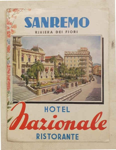 Pieghevole di 8 facciate di cm. 19,5 x 12; con una bella veduta panoramica grafica a colori su due facciate su parte di Sanremo con evidenziato l'hotel, numer. illustraz. fotograf. in nero e vignette a due colori ben impaginate; bella copertina grafica a colori firmata Musso. VG. ** Ben fatto e interessante per la veduta di Sanremo, le foto di interni, ecc.