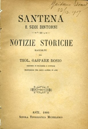 In-16°, pp. (6), 328, brossura muta. Dedicatoria a Giuseppina Alfieri di Sostegno. Una firma. Bell'esemplare, leggermente corto di margini. Prima edizione di questa documentata storia di Santena e del suo circondario dalla fondazione sino al XIX secolo, nel quale l'Autore 'non risparmiò studio e fatica alcuna per renderlo compiuto, usando ogni diligenza nell'investigare documenti e tradizioni per rintracciare memorie ignote o disperse' (dallaPrefazione). Nel 1984 l'opera ha conosciuto una ristampa anastatica a un secolo esatto dalla sua apparizione. Il Bosio, teologo e storico locale, fu professore nel Liceo Alfieri di Asti.