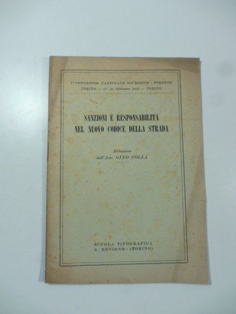 In 16 (cm 15 x 21), pp. 10. Brossura editoriale con bruniture ai piatti. Relazione presentata al V Congresso nazionale giuridico forense di Torino.