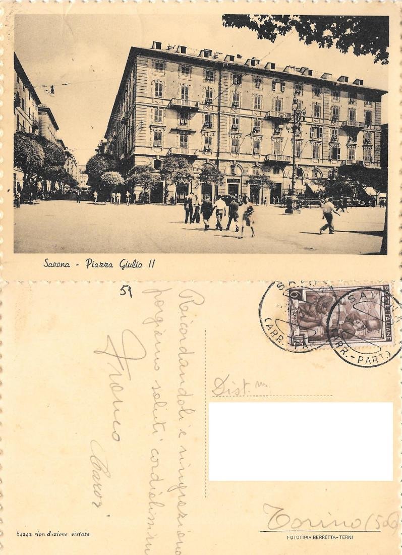 Savona. Piazza Giulio II. viaggiata 1951, animata
