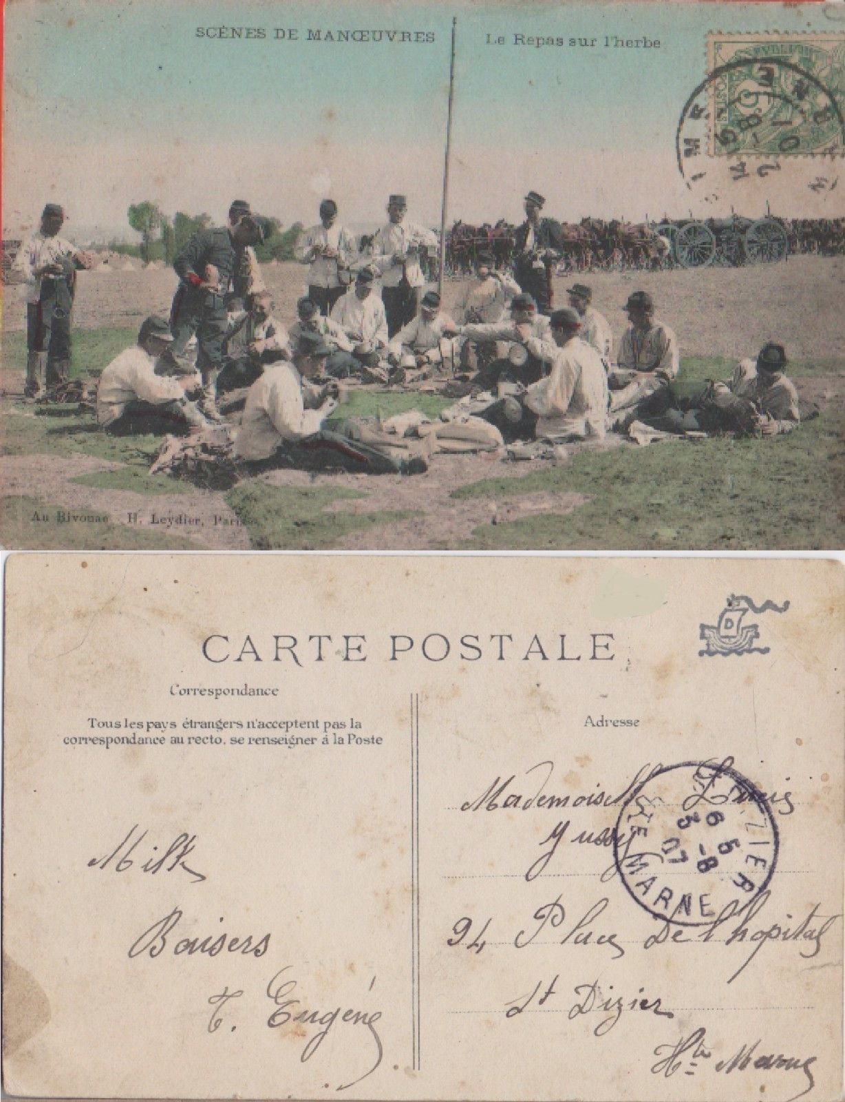 Scènes de manoeuvres - le repas sur l'herbe. Viaggiata 1907