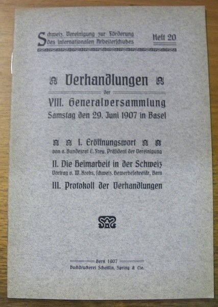 Schweiz. Vereinigung zur Forderung des Internationalen Arbeiterschutzes, Heft 20. Verhandlungen der VIII. Generalversammlung, Samstag den 29. Juni 1907 in Basel. I. Eröffnungswort von a. Bundesrat E. Frey, Präsident der Vereinigung. II. Die Heimatarbeit in der Schweiz. III. Protokoll der Verhandlungen.