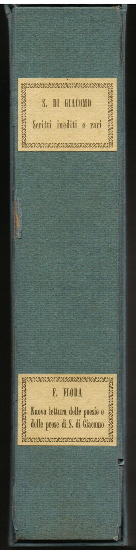 2 voll. in-8°, pp. (8), 290, (4); 116, (4); brossure editoriali con sovraccoperte incamiciate. Custodie e camicie editoriali cartonate. Illustrazioni in b.n. e a colori f.t. Perfetta copia entro velina. Prima edizione. Il primo volume raccoglie una serie di scritti di scritti inediti o rari del grande poeta napoletano, nonché alcune sue lettere. Il secondo volume contiene invece un penetrante scritto critico del Flora sull'opera di Di Giacomo. Pubblicazione per il centenario della nascita del poeta.