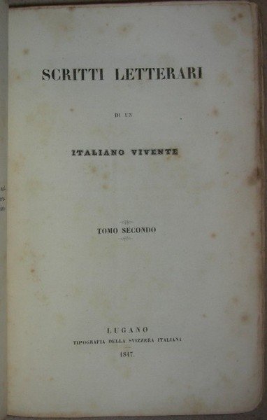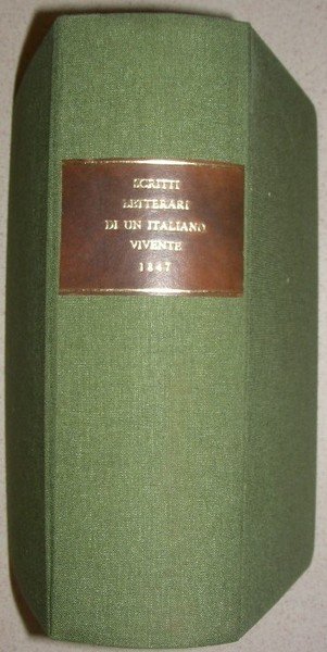 3 parti in un gr. vol. in-8, pp. 317, (2); 318, (2); 403, leg. mod. t. tela con tass. in pelle e tit. oro al d. Ediz. orig. contenente scritti del Mazzini in materia di letteratura, arte e storia. [190]