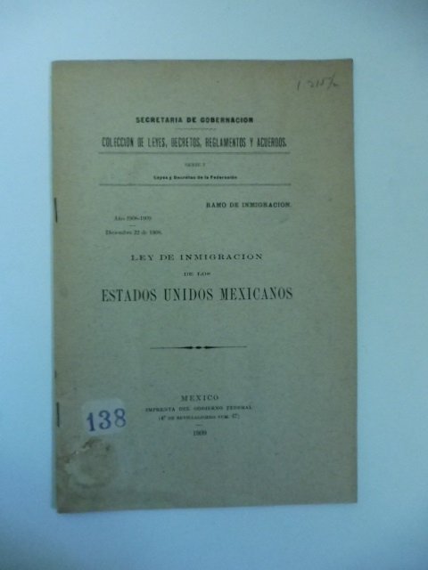 Secretaria de gobernacion. Colleccion de leyes, decretos, reglamentos y acuerdos. Ley de inmigracion de los estados unidos mexicanos