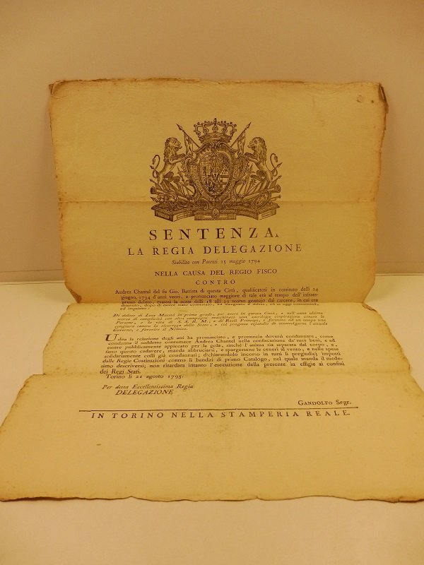 Manifesto cm. 31 x 43 con stemma xil. Importante e rara sentenza in data Torino 21 agosto 1795 relativa ad un congiurato di uno dei primi moti giacobini avvenuti in Piemonte. Chantel Andrea e suo fratello Giovanni Battista  furono due dei capi della conventicola repubblicana di cui facevano parte anche Junod, Bonafous, Arvel, Baratta ecc. nata con l'intenzione di favorire l'invasione francese. In realta' l'insurrezione fu soffocata sul nascere a causa di una serie di delazioni, in particolare quella del medico Barolo che, consegnatosi il 25 maggio denunzio' almeno trentacinque giacobini. Di questi alcuni come Giovanni Battista Chantel e Francesco Junod vennero impiccati e affrontarono con stoica determinazione il martirio, altri, come appunto Andrea Chantel (evaso dal carcere), Cherrise, Junod Fiando ecc. , riuscirono a fuggire e vennero impiccati in effige.