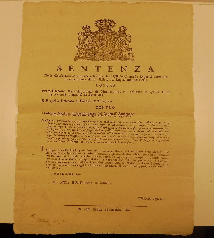Manifesto cm. 31 x 40 con stemma xil. Rara e importante sentenza di morte in data Asti 22 agosto 1797, emessa in seguito ai moti rivoluzionari avvenuti in Asti il 22 luglio 1797 e che portarono alla proclamazione della Repubblica astese il 28 dello stesso mese. Il 30 l'intervento del marchese Mazzetti di Frinco, a capo di 150 contadini, mettera' fine a questa brevissima esperienza rivoluzionaria. Questa esecuzione fu la sesta fucilazione avvenuta a seguito dei moti, eseguita il 23 agosto. Il Valle, nativo del luogo di Mongardino, viene qui definito bettoliere mentre il Merlone residente ad Antignano viene anche accusato di aver minacciato i suoi compaesani fedeli al Sovrano.