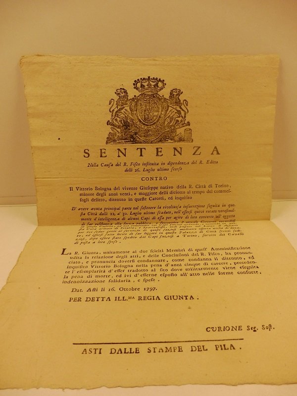 Manifesto cm. 30 x 40 con stemma xil.  Importante e rara sentenze in data Asti 16 ottobre 1797, emessa in seguito ai moti rivoluzionari scoppiati il 22 luglio 1797 e che portarono alla proclamazione il 28 luglio della Repubblica astese. Il 30, il Marchese Mazzetti di Frinco, a capo di 150 contadini, soffoco' la rivoluzione riportando il potere Regio. Delle otto sentenze emesse in seguito ai disordini, questa fu l'unica che non condanno' il reo a morte ma a cinque anni di carcere e all'esemplarita', sicuramente grazie alla giovane eta' del Bologna.