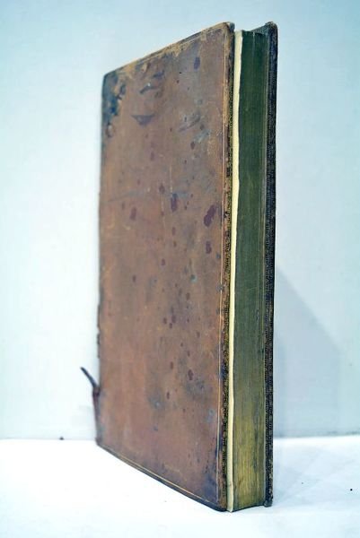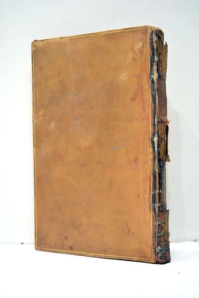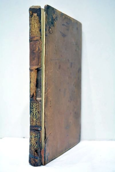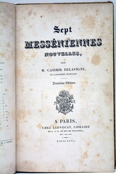 in-8. 4 feuillets. pages 13-240. Incomplet de feuillets de musique. (21x13,5cm). Plein veau blond de l'époque. Dos à nerfs orné. Pièce de titre manquante. Filet doré en encadrement des plats. Frise intérieure dorée. Roulette dorée sur les coupes. Tranches dorées. Plat supérieur détaché. Plats tachés et un peu frottés. Coins émoussés. Dos partiellement décollé. Coiffes manquantes. Charnière du plat inférieur recollée. Rousseurs éparses. Mouillures et salissures aux derniers feuillets. Seconde édition. Casimir Delavigne (1793-1843) est un poète et dramaturge français. Ces nouvelles "Messéniennes" furent rédigées lorsqu'il séjournait en Italie. La présente édition est accompagnée de nombreuses notes au sujet des lieux visités par l'auteur. Fine reliure du temps qui mérite une restauration.