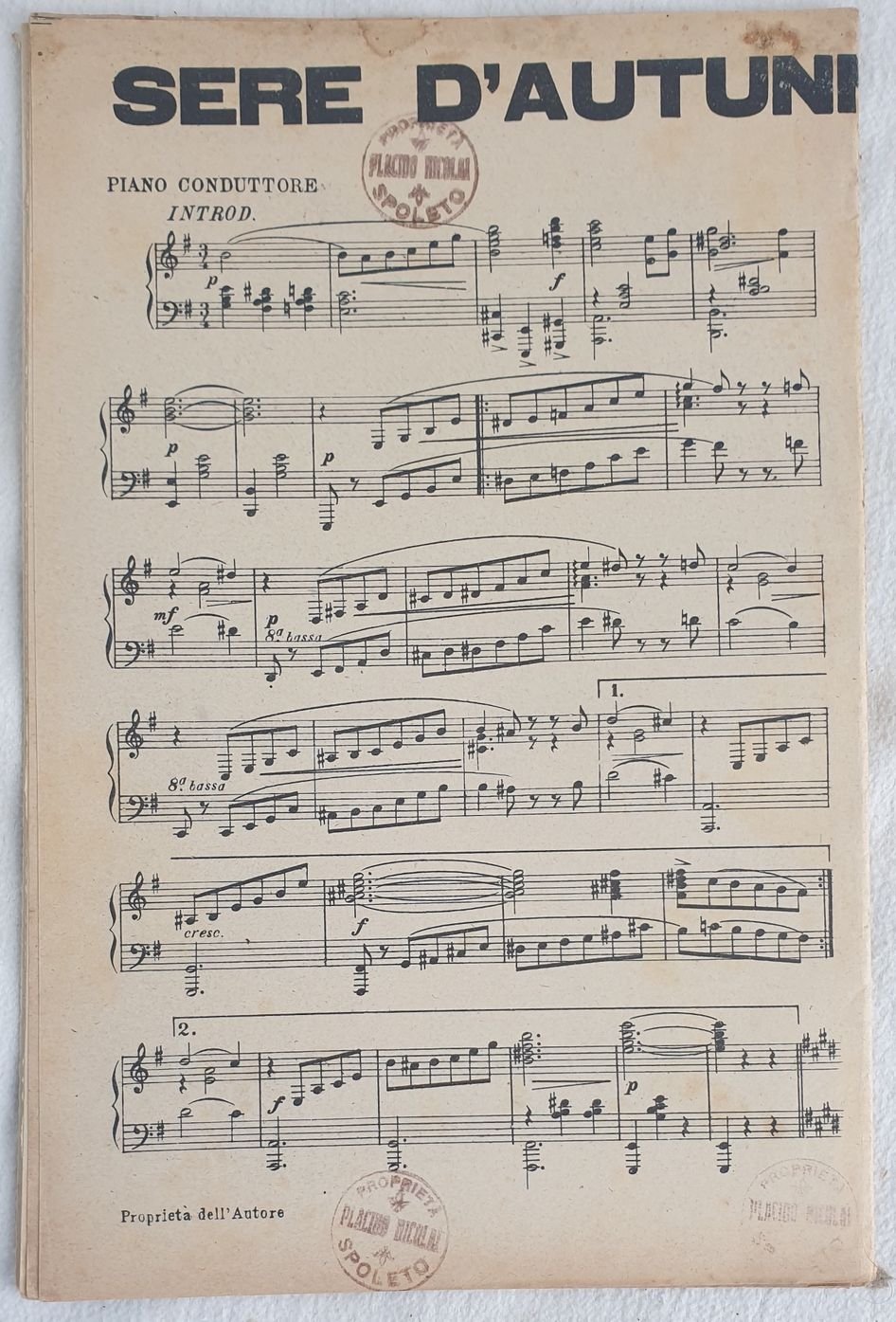Partitura completa per orchestra del 1930 delle melodie di U. Tumolillo "Sere d'autunno" e "Malia di zingara". GENERE: Valzer STRUMENTI: pianoforte, violini; violoncello; contrabasso, tromba, trombone, sassofono, clarinetto, flauto, batteria ANNO: 1930 DIMENSIONI: In 8. cm 27x18 PAGINE: pp. 24 CONDIZIONI: Buone condizioni. Copertina mancante. Complete score for orchestra of 1930 of the melodies of U. Tumolillo Sere d'autunno" e "Malia di zingara".<BR>MUSIC: waltz STRUMENTI: piano, violin; violoncello; contrabbass, trumpet, trombone, saxophone, clarinet, flute, drums<BR>YEAR: 1930 SIZE: In 8. cm 27x18 PAGES: pp. 24 CONDITIONS: Good conditions. cover lacks