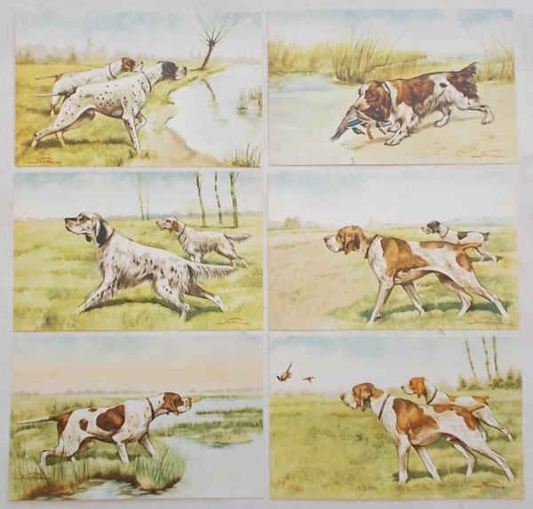 N. 6 cartoline di cm. 8,8 x 13,9. Originali, perfettamente conservate e con colori freschissimi, non viaggiate. Riteniamo siano databili al periodo compreso tra il 1930 e il 1940 circa. A pieni colori. Tutte sono pubblicate sul libro “Vita e opere di Mario Norfini” alle pagg. 69, 66, 110, 84, 67, 68. ** I soggetti sono: 1) Spaniel riporta germano reale. 2) Bracchi italiani in ferma e fagiano colpito. 3) Pointers in ferma. 4) Pointer in ferma. 5) Bracchi italiani in ferma. 6) Setters in ferma.
