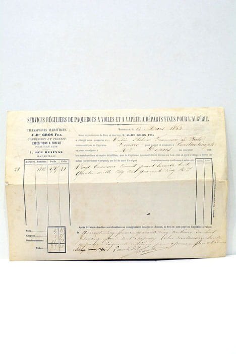 1 feuille. (18x25,5 Cm). 1 feuille. Connaissement completé à la main concernant une cargaison de Ciment en partance pour Constantinople. Trace de pli. Petits accrocs.
