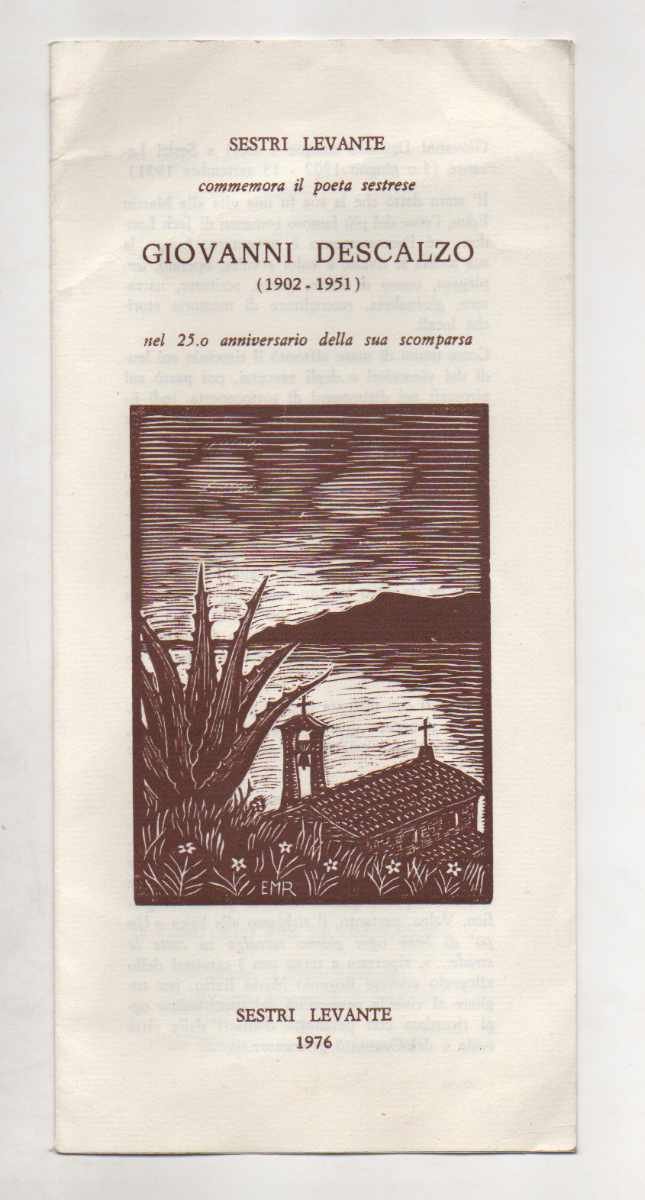 EPHEMERAPrima edizione.Ottimo esemplare (lievi pieghe alla testa delle carte). Documento commemorativo stampato a settembre 1976 in occasione dei 25 anni dalla morte del poeta stampato su carta Ingres Fabriano. Alla quinta facciata si legge: -- «Il comitato per le onoranze: - comune di Sestri Levante; - Azienda autonoma di Soggiorno; - università popolar; - Gruppo «Amici di Descalzo»» sotto lo stemma del comune di Sestri Levante. Alla sesta facciata, «riportata con i caratteri dello xilografo sestrese Eugenio Mario Raffo» è stampata la lirica ««Un po' di bene ogni giorno». Rarissimo.