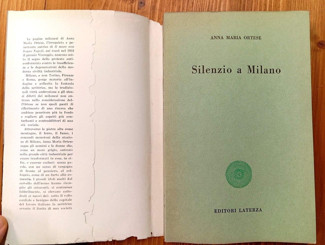 Prima edizione. Collana "Libri del tempo", 47 - Brossura editoriale con sovraccoperta illustrata a colori da Mimmo Castellano, 140 pagine. Raccolta dei reportage milanesi di Ortese pubblicati negli anni ‘50 su "L'Europeo" e "L'Unità". Usure e tarlature ai margini della sovraccoperta, specie intorno alle bandelle; il volume in sé risulta invece integro e ben conservato; edizione originale non comune.