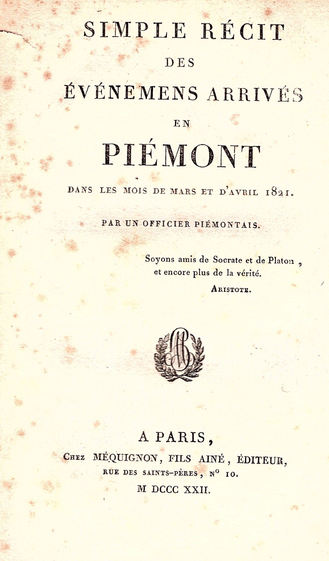 Simple récit des événemens arrivés en Piémont dans les mois de mars et d'avril 1821. Par un Officier Piémontais
