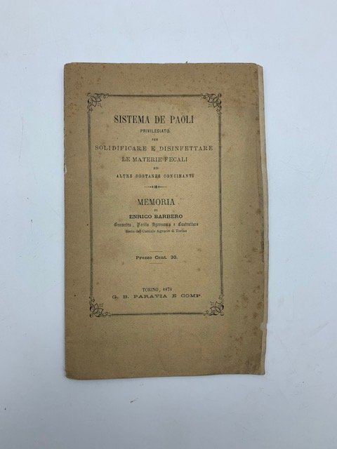 Sistema De Paoli privilegiato per solidificare e disinfettare le materie fecali ed altre sostanze concimanti. Memoria