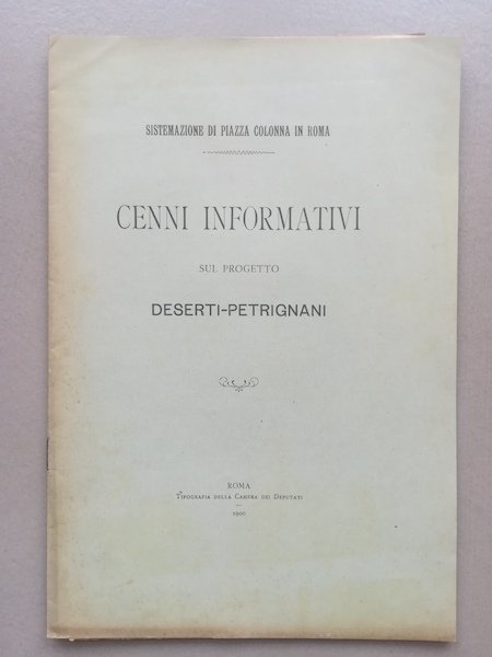 In 8 (cm 18,5 x 27,5), pp. 7 + (1b). Brossura editoriale. Cenni relativi al progetto di risistemazione di Piazza Colonna, a Roma, proposto dall'Impresa dell'ingegner Deserti e firmato dall'architetto Antonio Patrignani.