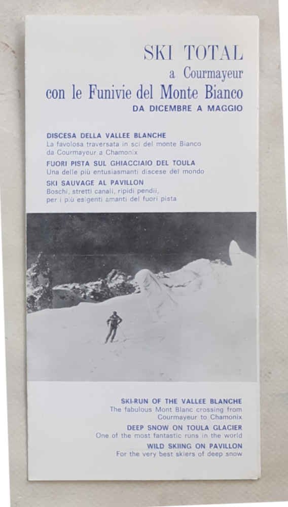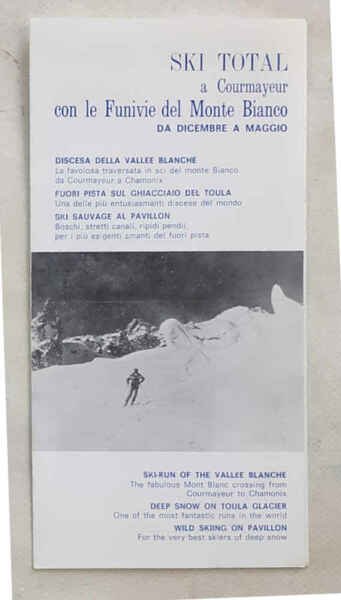 Pieghevole di 6 facciate di cm. 21 x 11; copertina con illustraz. fotograf. VG. ** Discesa della Vallée Blanche, Toula, ski sauvage al Pavillon.
