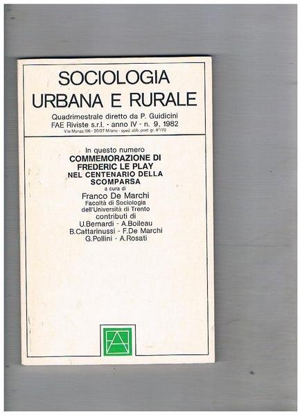 Sociologia Urbana e Sociale, quadrimestrale anno 4° n° 9 del 1982. Contiene: Commemorazione di Frederic Le Play nel centenario della scomparsa a cura di F. De Marchi e d altri.