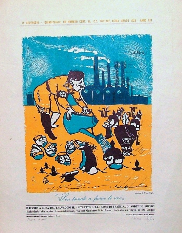 Locandina, linoleum, di cm. 49,5 x 37,5. Firma in basso a destra. Prova d'autore in basso a sinistra. Dal quindicinale Il Serlvaggio.