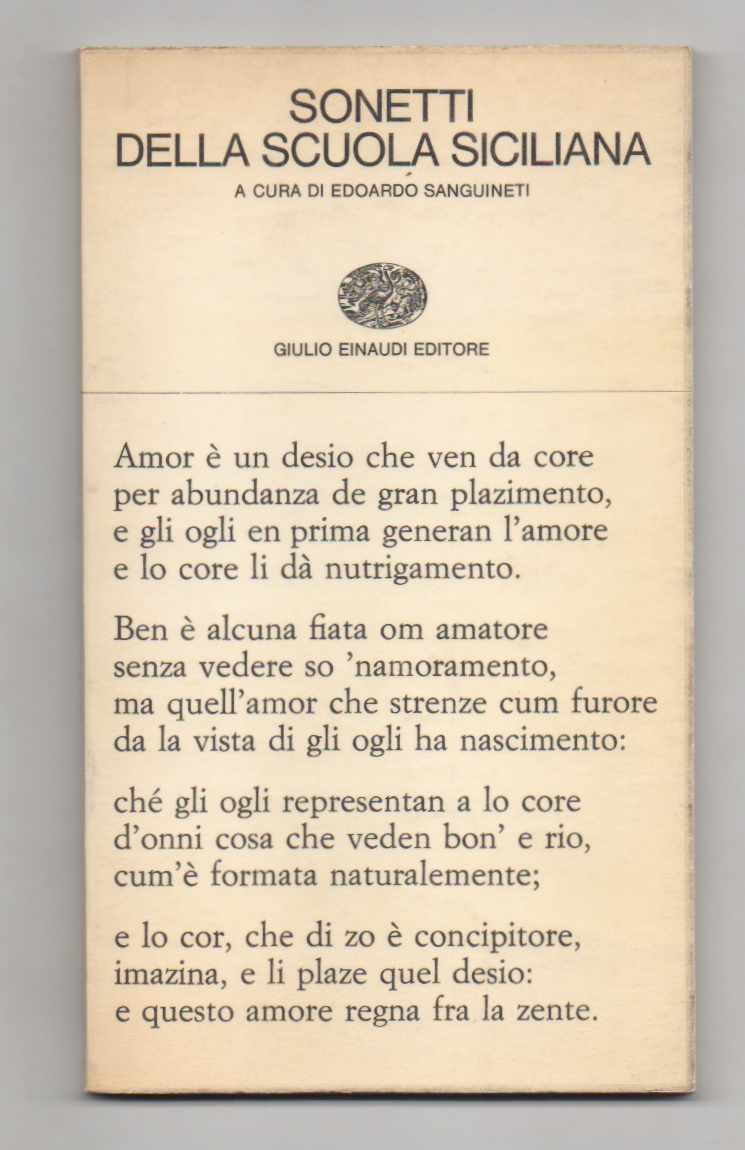 LIBRO Prima edizione. Brossura brunita ma per il resto ottimo esemplare. Firma di possesso alla prima carta. Prima edizione dell’antologia di sonetti di poeti siciliani del Duecento curata da Edoardo Sanguineti per Einaudi nel 1965. Nella prefazione, il poeta e saggista genovese scrive: «Chi si muova per un po’ attraverso queste pagine di poesia siciliana, dovrà comunque ripiegare come a sensazione conclusiva, sopra gli effetti sentenziosi e proverbiali, sempre meglio indiscriminando gli episodi illustrativi e gli avvolgimenti dimostrativi. È quanto dire che il sonetto, già nel suo primo tempo, si configura con sostanza epigrammatica. Non si deve credere, certamente, che la punta debba stare meccanicamente in coda, come capita allo scorpione: ma la consuetudine di lettura e la comparazione dei risultati insegna infine che, esagerando un po’ nell’indicare la cosa, un sonetto siciliano, quando è buono, è tutto coda».