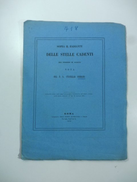 In 4 (cm 23,5 x 31 circa), pp. 10 con 1 tavola finale ripiegata con lo schema delle stelle cadenti del 10 agosto 1875 osservate al Collegio romano. Brossura editoriale. Estratto agli Atti dell'Accademia Pontificia de' Nuovi Lincei.