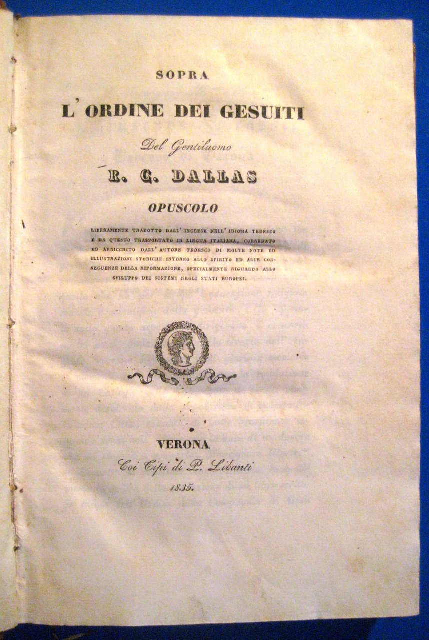 Sopra l'ordine dei gesuiti. Opuscolo liberamente tradotto dall'inglese nell'idioma tedesco e da questo trasportato nella lingua italiana. corredato e arricchito dall'Aut. tedesco di molte note ed illustrazioni storiche intorno allo spirito e alle conseguenze della riformazione, specialmente riguardo allo sviluppo negli stati europei.