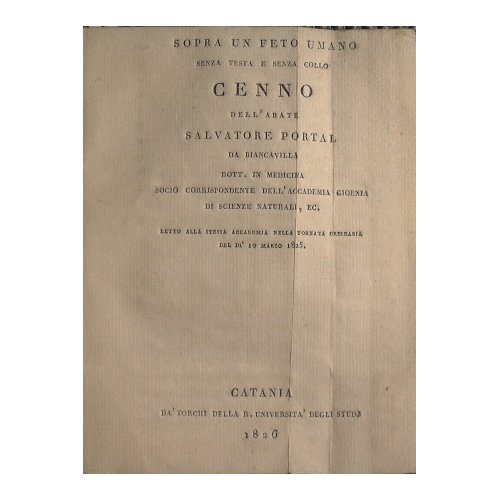 Sopra un feto umano senza testa e senza collo cenno dell'Abate Salvatore Portal da Biancavilla … socio Corrispondente dell'Accademia Gioienia….