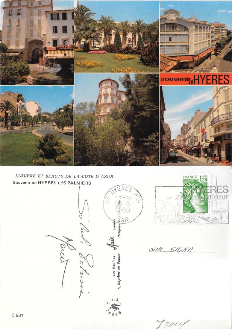 Souvenir d'Hyeres (FRA). Viaggiata 1980