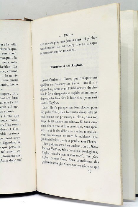 Frontispice, 375 pages (13x21cm). Reliure Ancienne Cuir. Guirlande dorée et plaque décorative sur les plats qui sont un peu frottés. Coins émoussés. Très bon état à l'intérieur. Ex-libris au contreplat. Jolie gravure en frontispice représentant le "Bassin du Commerce. Une vue du port de la Barre". Saint-Paterne. Le Mont Saint-Bernard. Lyon. Auxerre. Rhou. Rollon. Harfleur. La Chapelle de Barre-y-va. Graville. Le Havre. Le Phare de Catteville. Honfleur. Les Pays de Caux. Yvetot. Rouen.
