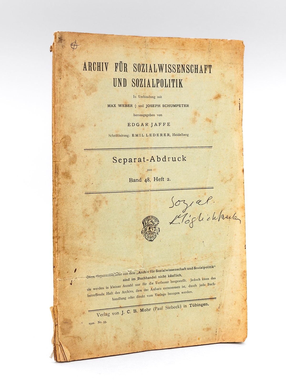 Archiv für Sozialwissenschaft und Sozialpolitik. Separat-Abdruck aus Band 48, Heft 21, 1 brochure in-8, Verlag von J. C. B. Mohr (Paul Siebeck), Tübingen, 1921, pp. 305-360 Edition originale. Très rare exemplaire du tiré-à-part. Un article important qui anticipe sur les travaux que Schumpeter publiera ultérieurement sur le sujet, pour aboutir à son oeuvre maîtresse "Capitalism, socialism and democracy". Etat très satisfaisant (couverture frottée avec petits manques, nombreuses annotations de Georges-Henri Bousquet).