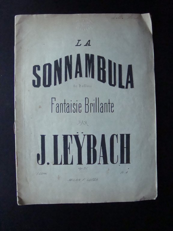 Spartito, † La Sonnambula"de† Bellini Fantasie Brillante Par J.Leybach op 27 F.Lucca, Milano, s.d, cm 35x25, pp. 12; br. ed.†con legatura a cordella; timbro del precedente rivenditore†e nome del precedente proprietario scritto a penna la margine sup. br.ant. Condizioni di conservazione Esemplare in buone condizioni con tracce d'uso e del tempo, br. con pieghe e strappetti agli angoli; intarni con bruniture e macchiette.† Opere per Pianoforte di J.Leybach† op.27† † SC03.D14104 BLU "