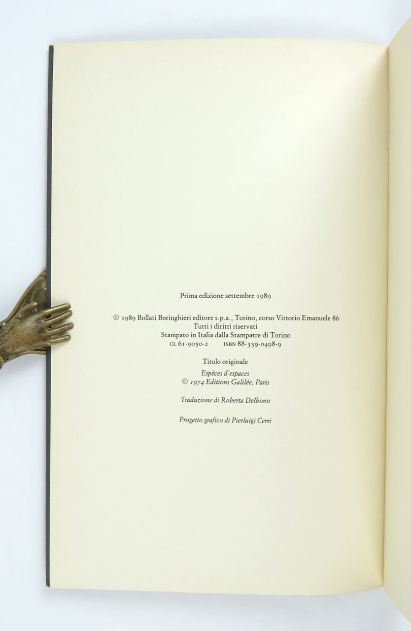 LIBROPrima edizione italiana.Ottimo esemplare, fresco e pulito (lievissima traccia di urto alla testa del dorso).Rara prima apparizione in Italia di «Espèces d’espaces», 1974. È stato ristampato dallo stesso editore nel 1999, nel 2008 e nel 2016. «Gli scritti raccolti nel piccolo trattato “Espèces d'espaces” (1974; trad. it. 1989) [.] illustrano la poetica di Perec: l’atto della scrittura prende le mosse dalla necessità continua di nominare e descrivere, fino a esaurire ogni possibilità di definizione; lo spazio letterario fa da eco allo spazio degli oggetti e attraverso le parole si tracciano le coordinate del mondo esterno» (Treccani, voce dell’Appendice VI, 2000, a c. di Simona Mambrini).