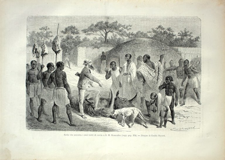 Speke che presenta i suoi trofei di caccia a S.M. Rumanika. Stampa 1864