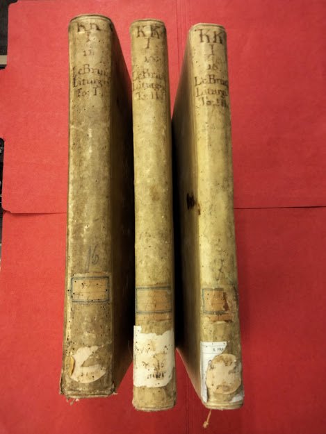 3 voll., in 4°, p. perg., pp. XXX + 320 (1° vol.) + XVI + 300 + 3 inc. nn. f. t. (2° vol.) + 305 + 3 inc. di cui 1 ripiegata, nn. f. t. (3° vol.). Capilettera. Tagli marmorizzati rossi. Il 1° vol. è mancante del front. Mende sui front. del 2° e 3° vol. 1° vol. presenta la cerniera staccata e il piatto post. sciolto. L'opera è mancante del 4° vol. Antichi forellini che interessano poche lettere.