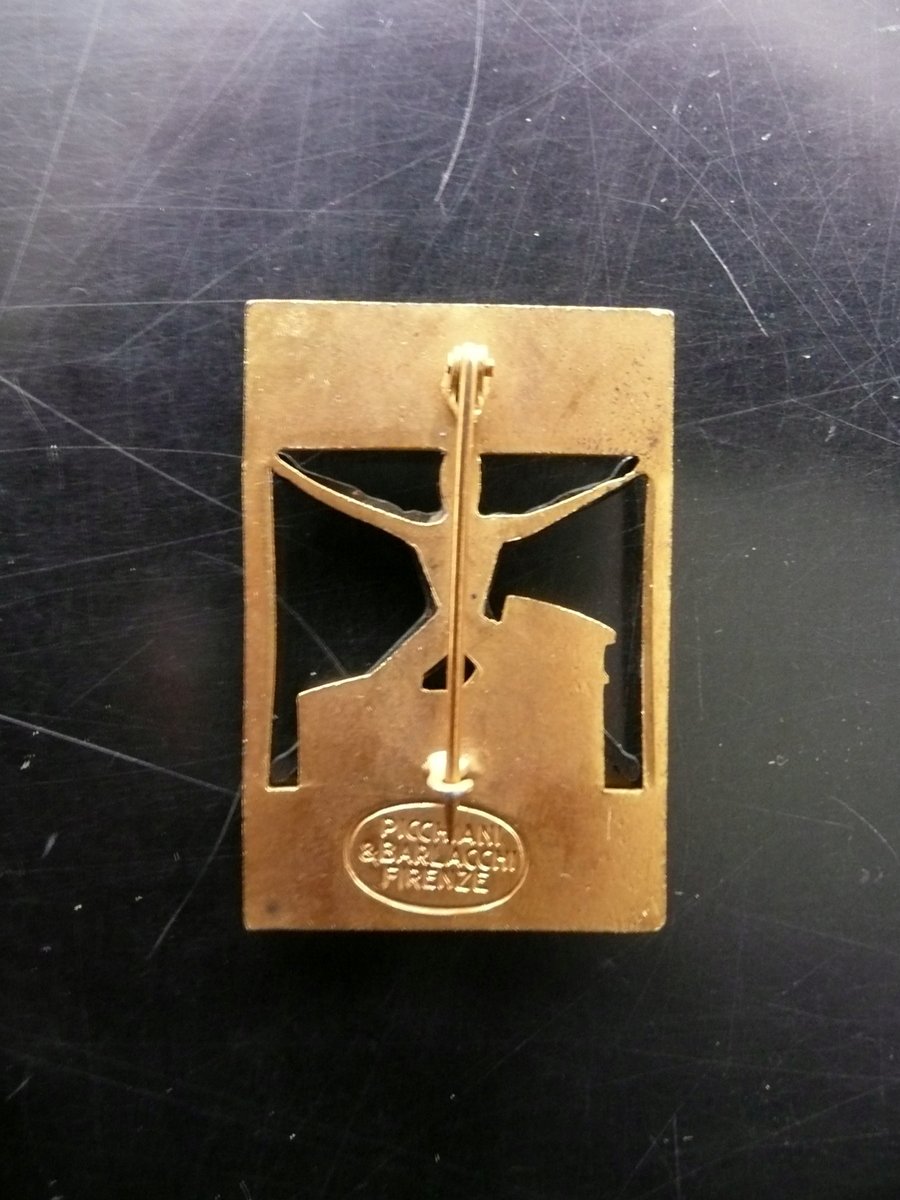 Spilla, XIII Campionati del Mondo di Ginnastica Roma 1954 FIG - CONI - FGI Picchiani & Barlacchi, Firenze 1954; spilla originale a colori, con fregio in rilievo; laccata in oro; cm 4x2,5. Condizioni di conservazione Esemplare ben conservato con minime tracce d'uso e trascurabili principi di sporco. SC04.D0083 N