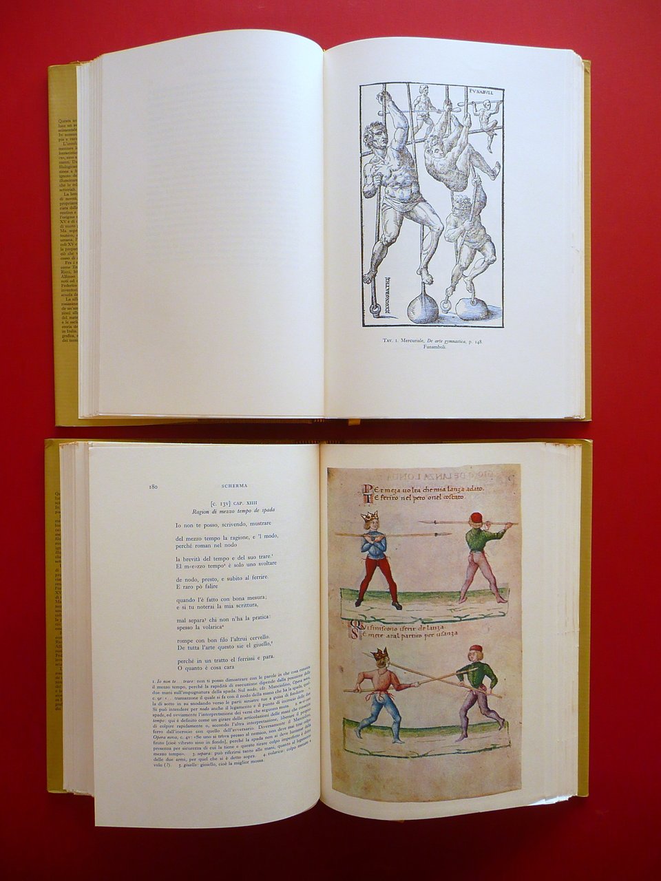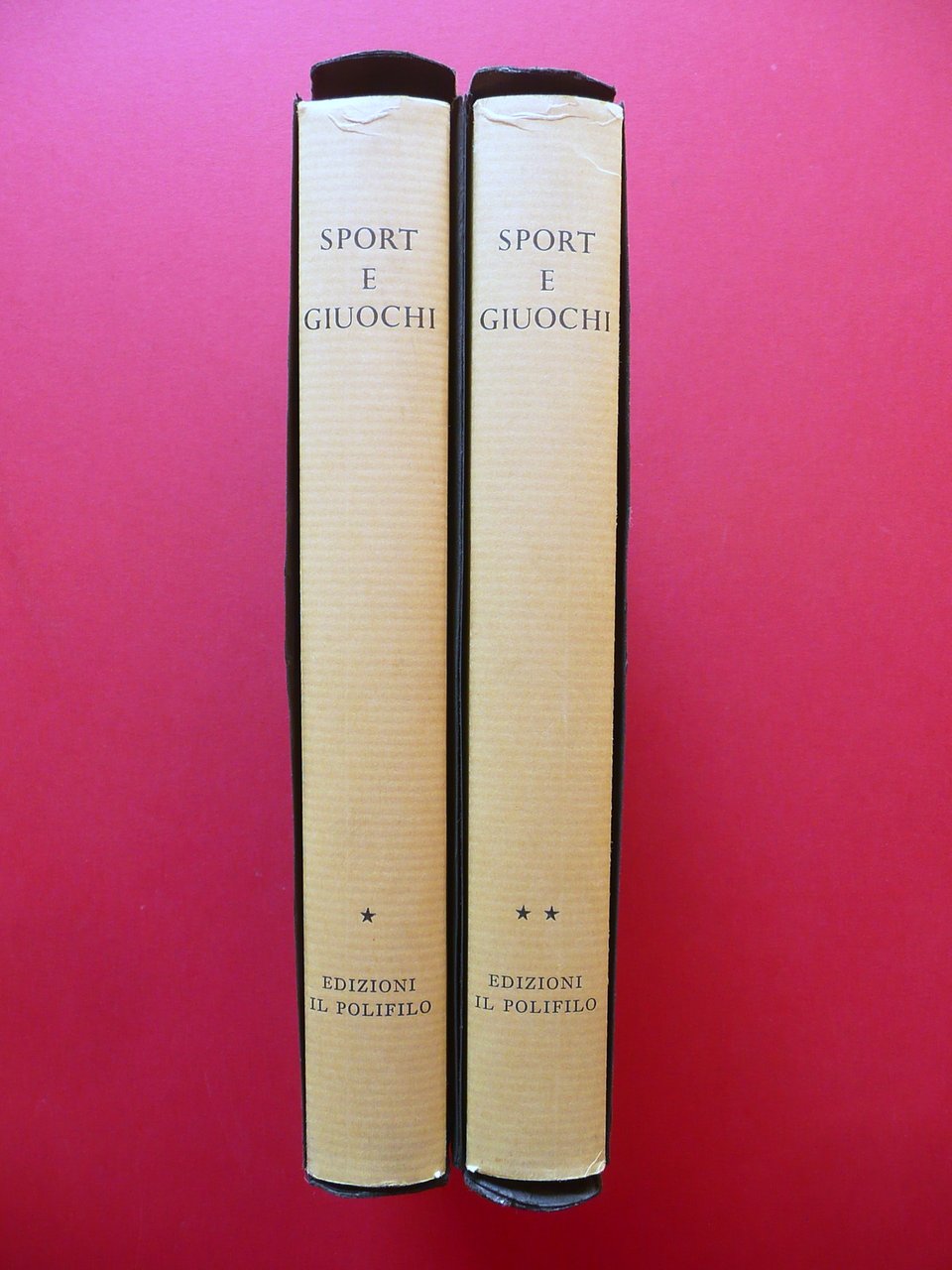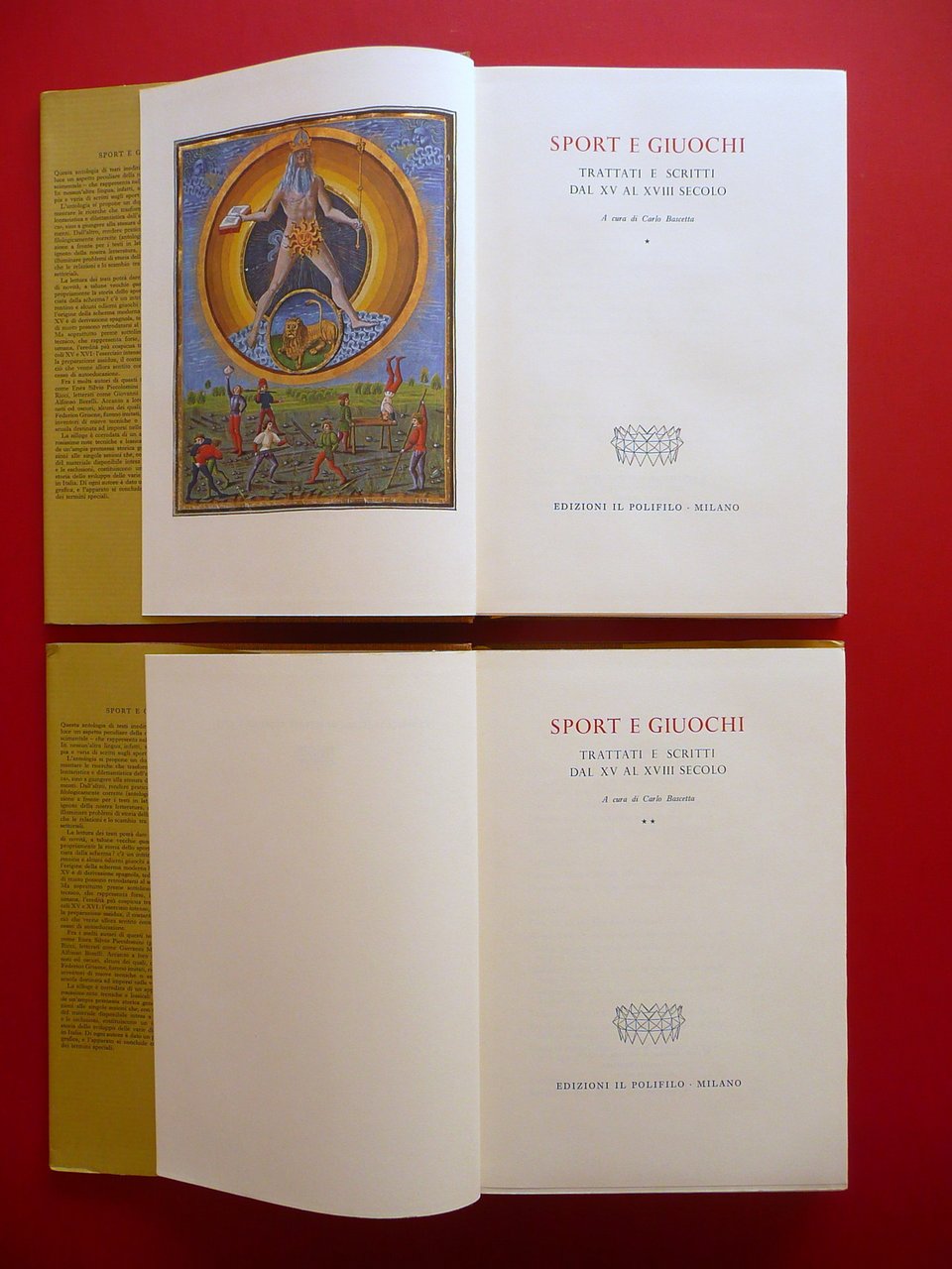 Carlo Bascetta (a cura di), Sport e Giuochi trattati e scritti dal XV al XVIII secolo Volume I - II (opera completa in due volumi) Edizioni il Polifilo, Milano 1978; cm 27x18,5; pp. LXVI-342, con alcune ill. in b/n fuori t.; antiporta figurata a colori (volume I); pp. 404 con alcune ill. in b/n fuori t. (qualcuna a colori); tutta tela ed. con titolo in oro entro tassello al dorso, sovraccoperta ed. ill. a colori. Opera completa in due volumi inseriti entro cofanetti ed. in cartoncino muto. Condizioni di conservazione Volumi entrambi molto ben conservati con leggere tracce d'uso, sovraccoperte ed. con minimi accenni d'ingiallimento al dorso dovuti ad eccessiva esposizione alla luce. Interni ottimi. Cofanetti ed. con alcuni difetti, piccoli / circoscritti strappetti e ammaccature ai margini e agli angoli. Opera completa in due volumi, di pregevole qualità grafica ed editoriale. SETT188.L17326 N