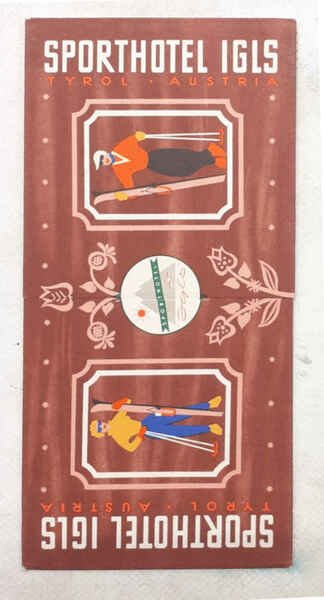 Cartellina ad album, originale e ben realizzata con grafica molto curata, che contiene sei tavole fotografiche che illustrano la stazione invernale e estiva, l'albergo e i suoi interni. VG. ** Ottimo. Si può anche non essere interessati a Igls, ma questa cartellina è "indispensabile" per chi si occupa di grafica, pubblicità, comunicazione, sci, alberghi, perfino di cartotecnica.