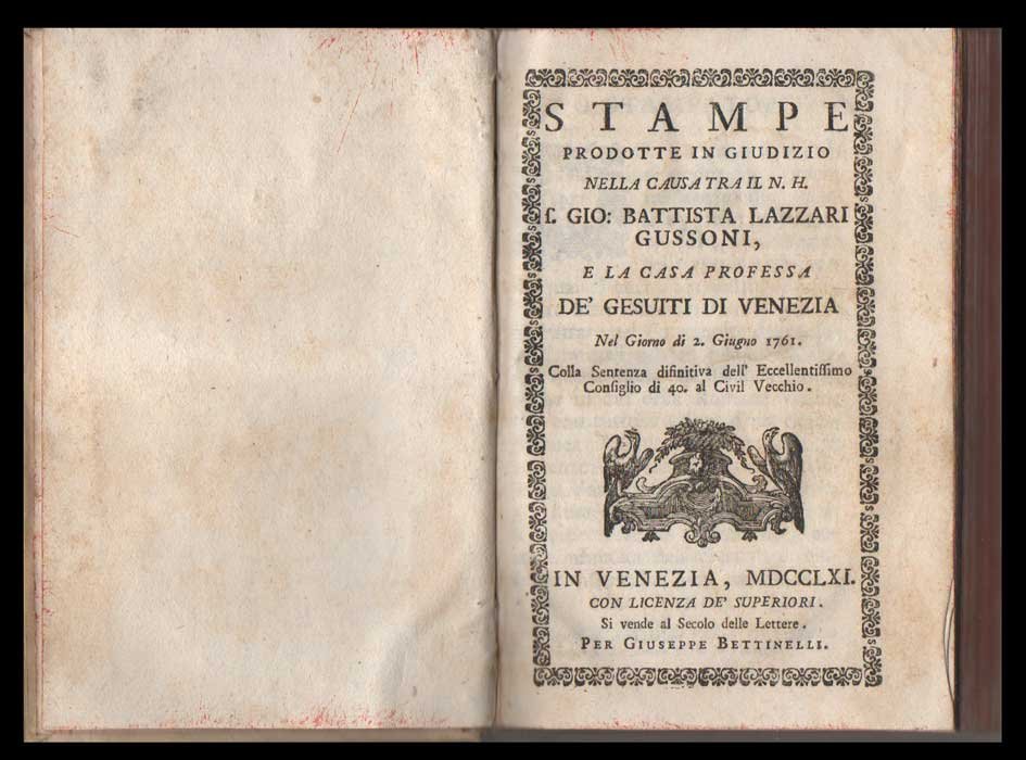 Stampe prodotte in giudizio nella causa tra il N.H. f. Gio. Battista Lazzari Gussoni, e la casa professa de' Gesuiti di Venezia . [unito a: Notizie sin qui pervenute della famosa causa . contro il Padre della Valetta et il Padre Generale de’ Gesuiti]