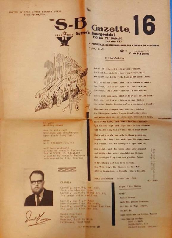 Formato giornale, 41x29, 8 facciate con poesie in varie lingue e traduzioni. Con alcune immagini. Periodico con inconsueta grafica. -(Leon Spiro è nato il 5 dicembre 1912; divenne poeta, contribuendo a oltre 600 periodici con traduzioni in nove lingue; è diventato direttore delle pubblicazioni Star West; è autore di Cobwebs from California (1973), Sea Webs from California (1976) e Passport (1978). Numero piegato, carta uniformemente brunita e piccoli forellini sulle pieghe.