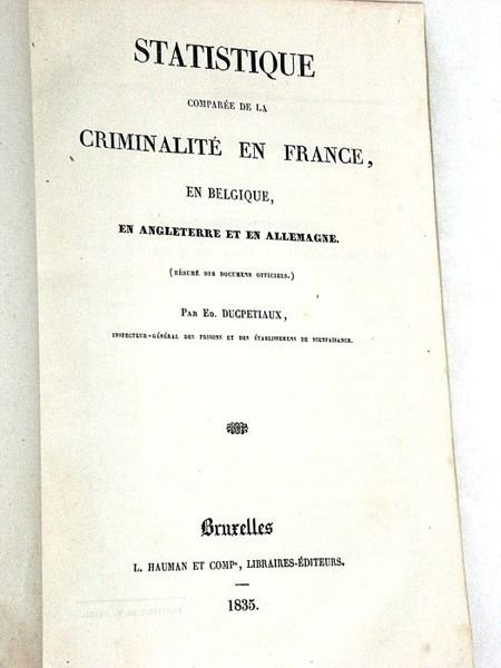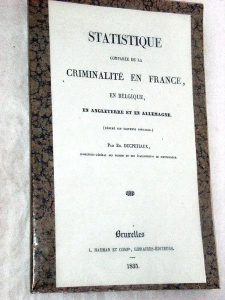 Grand in-8. 98pp. Broché, couverture postérieure protégée par du papier cristal. Bon exemplaire. Première édition. Intéressante étude statistique de l'économiste et philanthrope belge Edouard Ducpétiaux qui juxtapose ici les données statistiques de la criminalité de 4 pays européens. On doit notamment à l'auteur la fondation d'une école destinée aux jeunes délinquants.