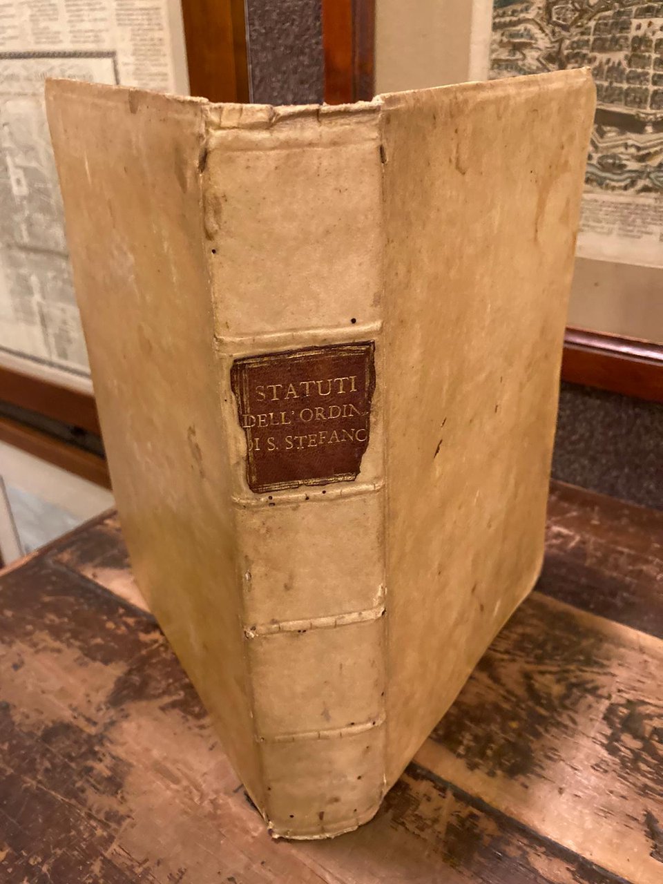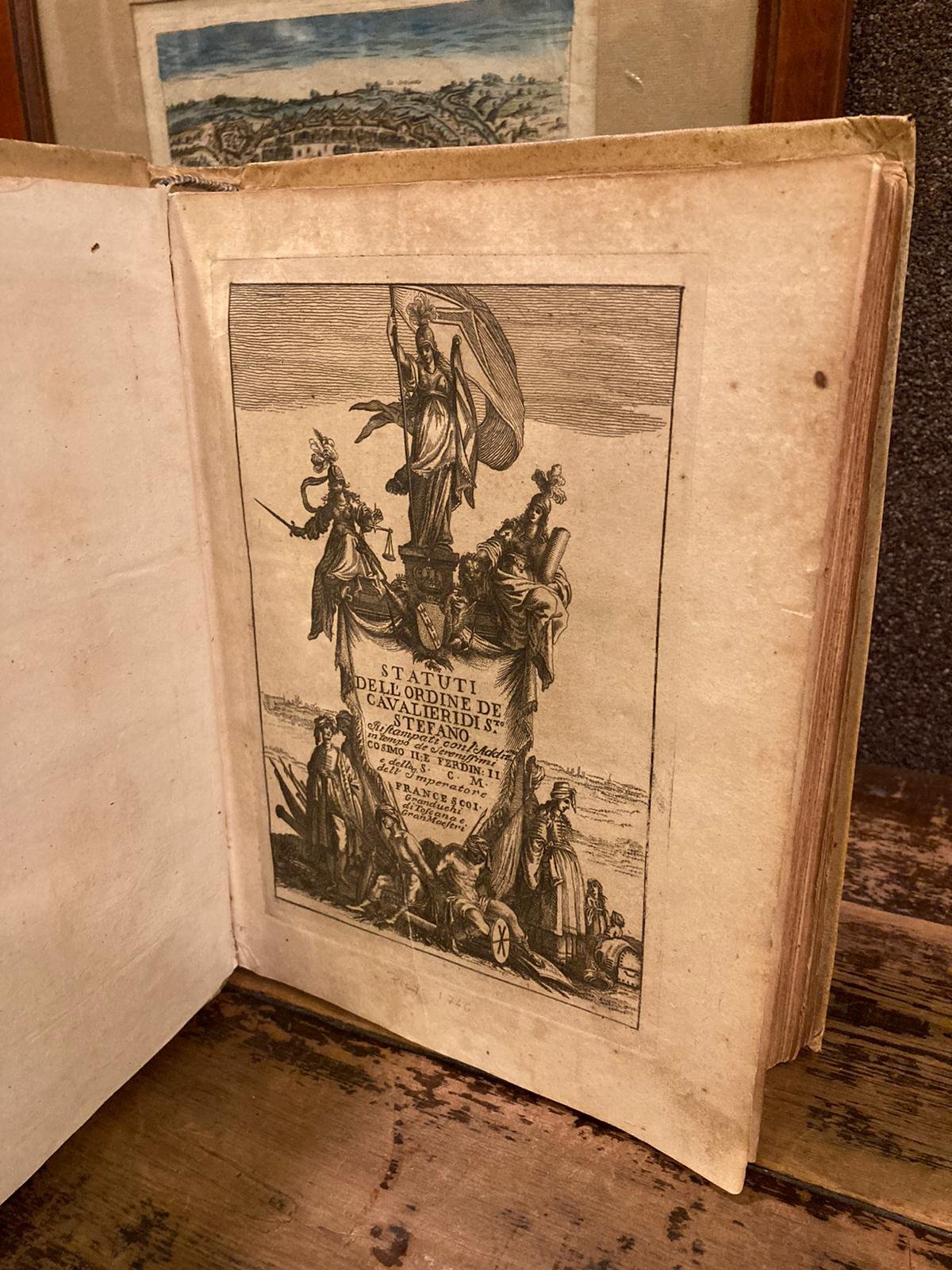 In-4° (280x210mm), pp. 396, legatura coeva in piena pergamena rigida con titolo su tassello marrone al dorso. Tagli spruzzati rossi. Magnifico frontespizio inciso su rame all'acquaforte da invenzione di Jacques Callot, con titolo entro drappo sormontato da blasone coronato e con figure allegoriche rimandanti ai Cavalieri di Santo Stefano. Testatine, capilettera e finalini istoriati su rame, dedicatorie preliminari. Le pp. 1-80 riproducono una quantità di bolle papali, privilegi, decisioni della Sacra Rota, decretali inerenti ai Cavalieri di Santo Stefano. Le pp. 81 e sgg., con numerazione continua e con foglio del titolo a sé con vignetta incisa, riproducono gli 'Statuti, Capitoli, e Constituzioni dell'Ordine de'Cavalieri di Santo Stefano, fondato, e dotato dal Serenissimo Cosimo Medici, Duca II di Firenze, e di Siena. Riformati dal Serenissimo Ferdinando Medici.'. Indici alle pp. 345-396; explicit tipografico al colophon. Bell'esemplare (qualche carta brunita). Riedizione pisana settecentesca (l'edizione originale fu impressa a Firenze nel 1562; la presente è l'ultima pubblicata, prima dell'anastatica del 1994) degli statuti del Sacro Militare Ordine Marittimo dei Cavalieri di Santo Stefano, istituito da Cosimo I de' Medici il 1° Ottobre 1561.
