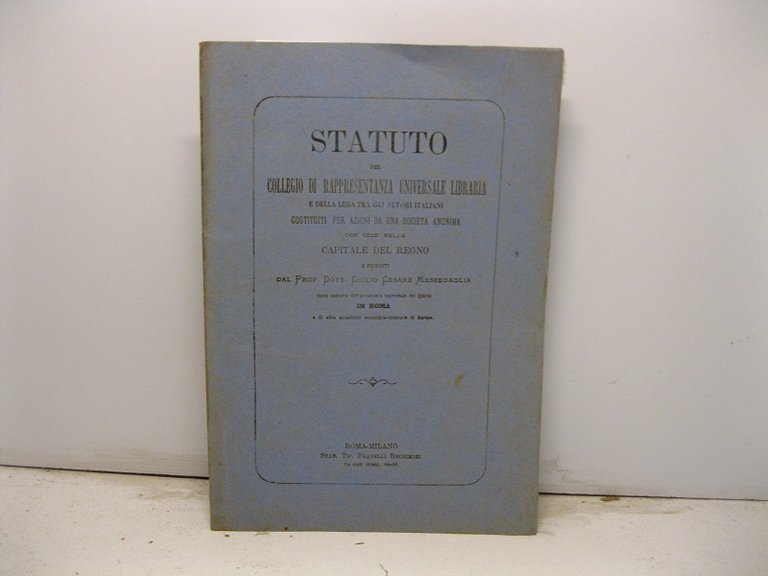 Statuto del collegio di rappresentanza universale libraria e della lega fra gli autori italiani costituiti per azioni da una societa' anonima con sede nella capitale del Regno e proposti da Giulio Cesare Messedaglia