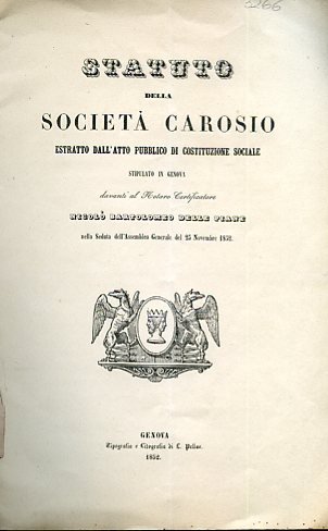 Statuto della Società Carosio estratto dall'atto pubblico di costituzione sociale stipulato in Genova davanti al Notaro Certificatore Nicolà Bartolomeo Delle Piane nella Seduta dell'Assemblea Generale del 25 Novembre 1852