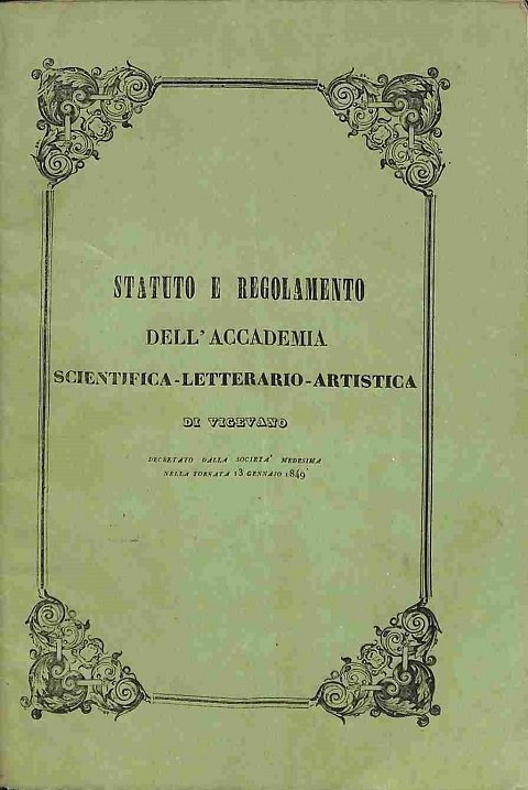 In 8 (cm 15 x 22,5), pp. 16 + (2 bianche). Qualche fioritura sparsa alle pagine. Brossura editoriale. Pubblicazione contenente lo statuto dell'Accademia scientifica-letterario-artistica di Vigevano, sorta dal Gabinetto letterario, che aveva lo scopo di svolgere l'educazione popolare mediante studi, letture e discussioni, sostenendo anche le pubbliche liberta'.
