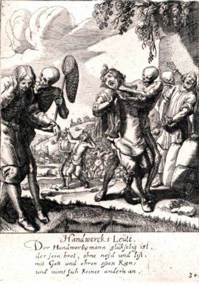 Handwercks Leüte. Blattgrösse 24,8 x 17,9 cm; Plattengrösse 13,7 x 9,5 cm, auf festem Papier. Massmann, S. 51. Leemann-van Elck, S 114. Faber du Faur S. 454. Lonchamp 2073. - 61 ganzs. Kupferstiche umfasst die Folge. "Dieser Totentanz ist ein Gipfelpunkt züricherischer Illustrationskunst" (Leemann-van Elck, S 115). - Radierung von der Original-Platte. - Ränder etwas unfrisch. - The indicated shipping costs refer to books weighing up to one kilogram. - Bücher, die schwerer als ein Kilogramm oder größer als 35 x 25 cm sind, werden als Paket verschickt und kosten innerhalb Deutschlands bis zu zwei Kilogramm 6 Euro, darüber hinaus 7 Euro Porto. -