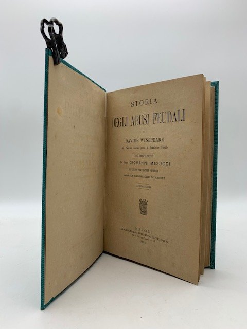 In 8 (cm 15,5 x 24), pp. XXII + 398 + (1) di errata + (1 bianca). Legatura moderna in piena tela. Seconda edizione di quest'opera sul feudalesimo. Consta di due parti: la prima di testo, la seconda con le note. L'A.(Portici 1775 - Napoli 1847), filosofo giurista, avvocato della Corte di Cassazione, fu destituito da questa carica da Ferdinando I, dopo l'esilio rientro' in patria, riprese la professione di avvocato per poi abbandonarla per seguire studi filosofici.